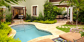 Luxurious suite with personal butler service and 24-hour room service is located on the ground floor of the Plantation Suite Building with a large living area and a separate bedroom. The suite features lavish West Indian mahogany-carved furniture, the bedroom has a four-poster mahogany king-size bed and a 40" plasma television. The large living room has a fully-stocked bar and 40" plasma television. The bathroom features double vanities, a walk-in shower and a whirlpool tub. The suite opens up to a lush private garden which includes a plunge pool and miniature waterfall, and an outdoor shower with a private wall to ensure intimacy.