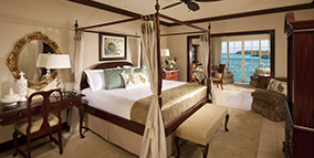 Perfectly located on the 1st - 3rd floors of the resort's much sought-after East and West Wings, this suite affords a remarkable view of the resort's stunning West or East Beach. This piece of paradise boasts a fully stocked wet bar, complete with premium liquors and wines. The spacious bedroom features a signature four-poster mahogany king bed, as well as a state-of-the-art plasma TV while the luxurious bathroom boasts dual bath vanities and marble finishing.